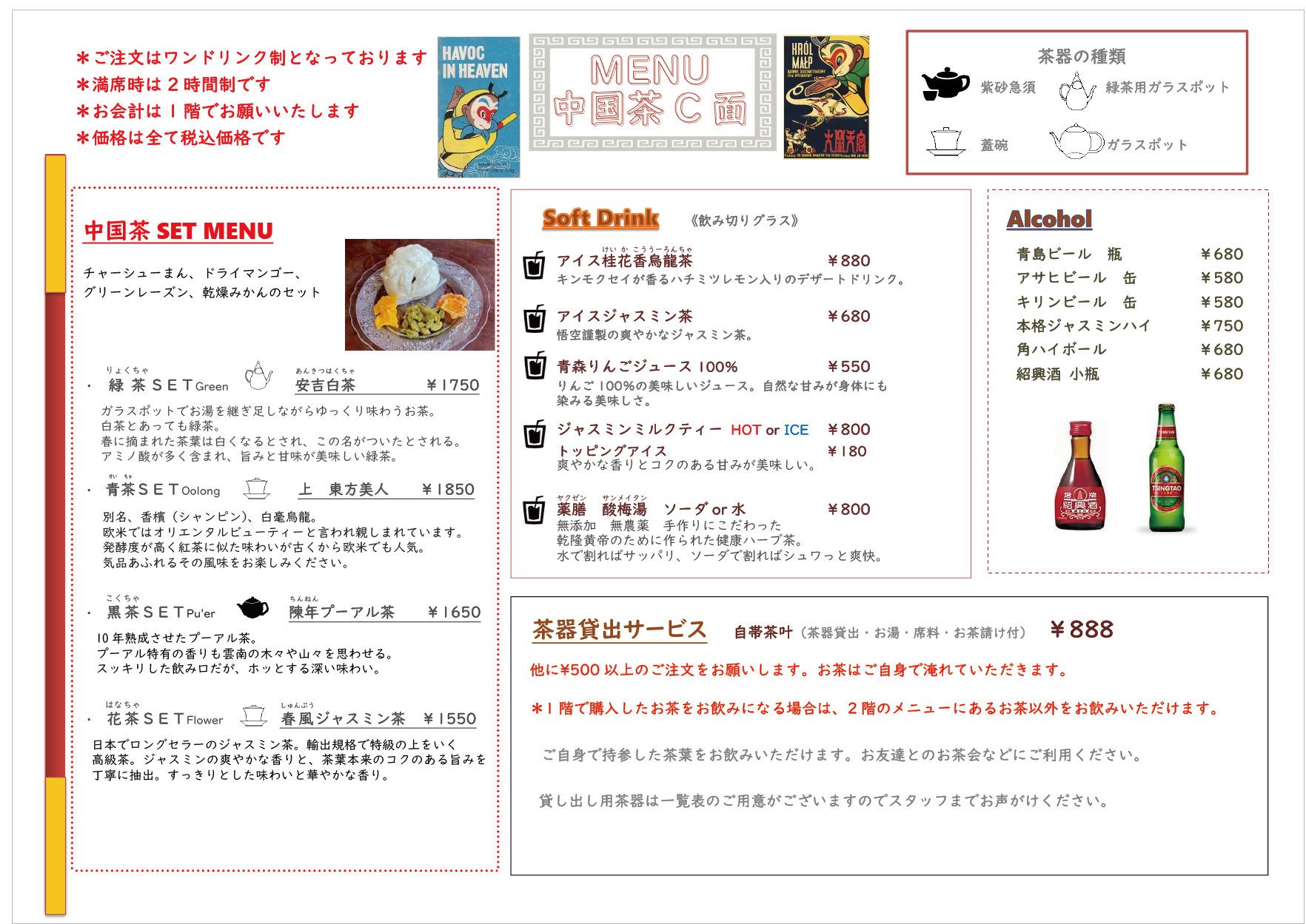 TOP 2階メニュー 悟空茶荘2階メニュー 2階メニュー 悟空茶荘2階メニュー 当HPで茶葉、茶器、雑貨の通信販売も行っておりますので、ぜひご利用ください。オンラインショップTOPはこちら 2階メニュー